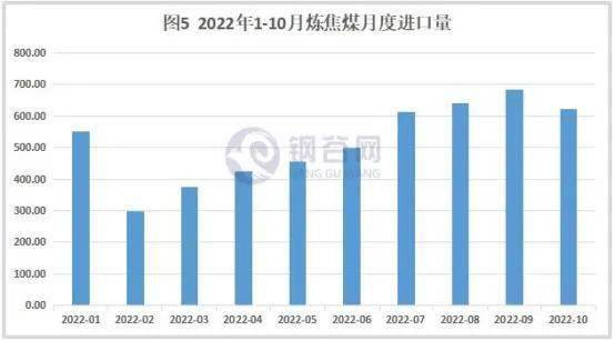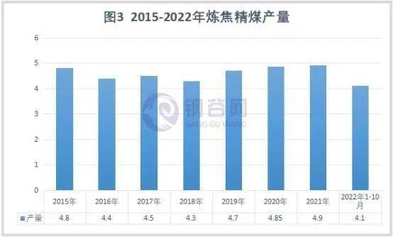 “十三五”期间减产能的规划实施,导致2015年后我国炼焦煤大幅的减产。2019年起,我国炼焦煤的产量有所回升,约为4.70亿吨。2021年我国炼焦煤产量进一步提升约为4.9亿吨。2022年1-10月份炼焦精煤1-10月总产量4.1亿吨。
