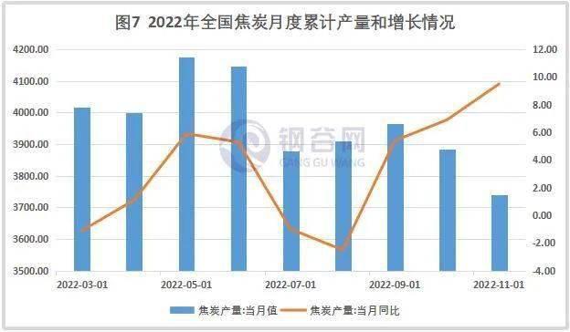从产量角度看,2022年焦化行业处于行业弱势地位,利润分配不足,抑制了焦企的生产开工意愿,再加上年内疫情扰动不断,因此焦炭生产基本都以利润为指导,产量仍维持相对平稳。据国家统计局数据显示,在2020年3月-2022年11月期间,全国焦炭月度产量同比增长最快的时间是2022年11月,当月同比增长率达到了9.5%。2022年11月全国焦炭月度产量为3739万吨,同比增长为9.50%。在2020年3月-2022年11月期间,全国焦炭月度产量累计达到了10.26亿吨,月均产量为3968.58万吨,月均同比增长率为-0.9%。其中2022年5月全国焦炭月度产量最高,达到了4176万吨,当月同比增长5.90%,而2022年11月焦炭月度产量最低,为3739万吨,当月同比增长9.5%。