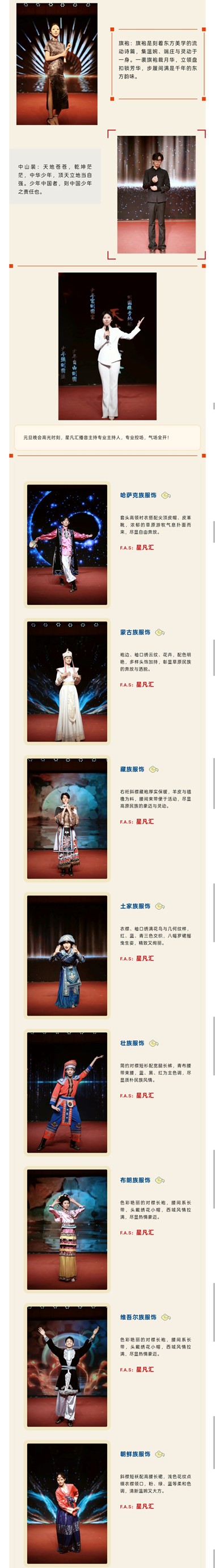 华服为媒,共叙团结情,五十六朵花,映照着祖国朝霞,五十六种心声,共诵我爱你中国。我们携手,走过风雨兼程的岁月,我们并肩,踏平前行路上的坎坷,让声音传递深情,让友爱浇灌繁花,同心筑梦新时代,共谱盛世好年华!