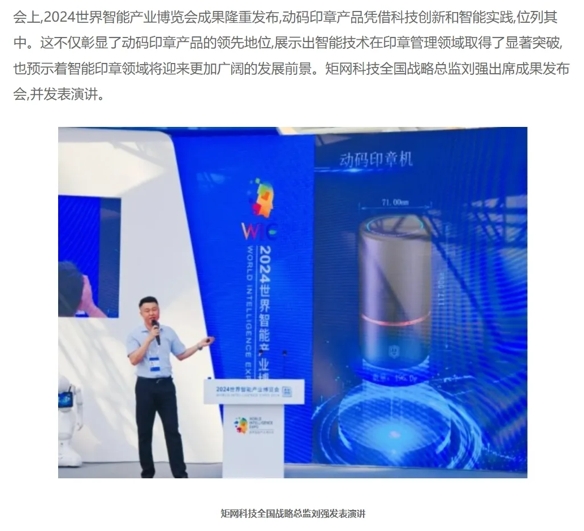 智能网、人民日报经济网消息,在当天的会上,2024世界智能产业博览会成果隆重发布,动码印章产品凭借科技创新和智能实践位列其中。这不仅彰显了动码印章产品的领先地位,展示出智能技术在印章管理领域取得了显著突破,也预示着智能印章领域将迎来更加广阔的发展前景。矩网科技全国战略总监刘强出席成果发布会,并发表演讲。