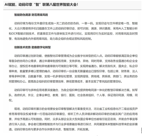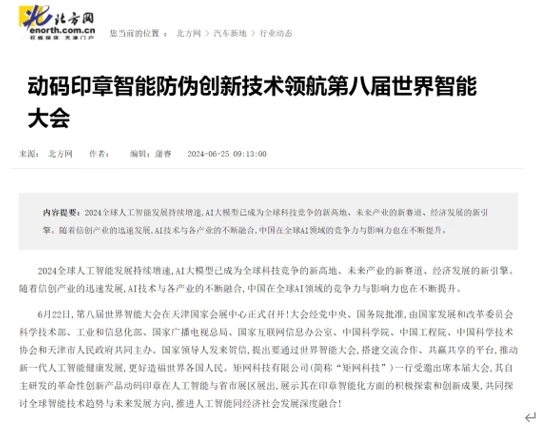 北方网、智能网、人民日报经济网等媒体报道:动码印章智能防伪创新技术领航第八届世界智能大会