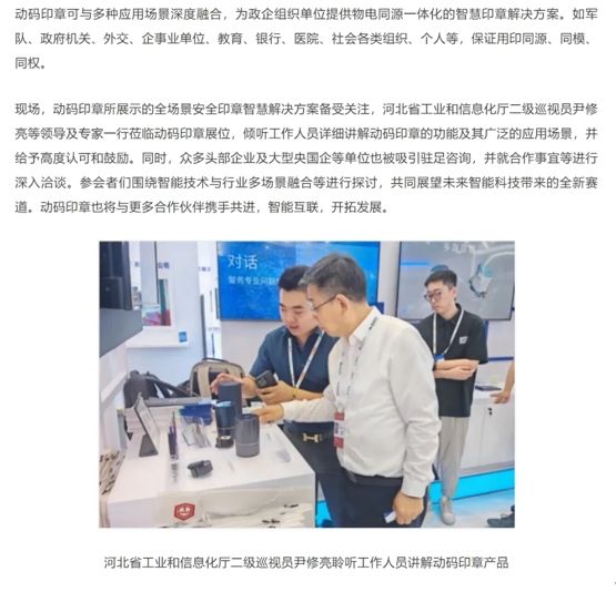 站长之家、凤凰网河北、新浪财经、北京商报网等媒体则介绍了动码印章的应用场景。动码印章可与多种应用场景深度融合,为政企组织单位提供物电同源一体化的智慧印章解决方案。如军队、政府机关、外交、企事业单位、教育、银行、医院、社会各类组织、个人等,保证用印同源、同模、同权。