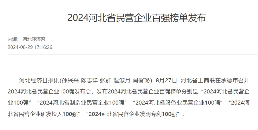 “河北省民营企业发明专利100强”,是河北省工商联根据企业的发明专利数量、专利的质量和实际应用效果等,评选出的在技术创新方面表现突出的典型企业,对于激发河北省民营企业的创新活力,为河北省经济发展注入新动力具有重要意义。