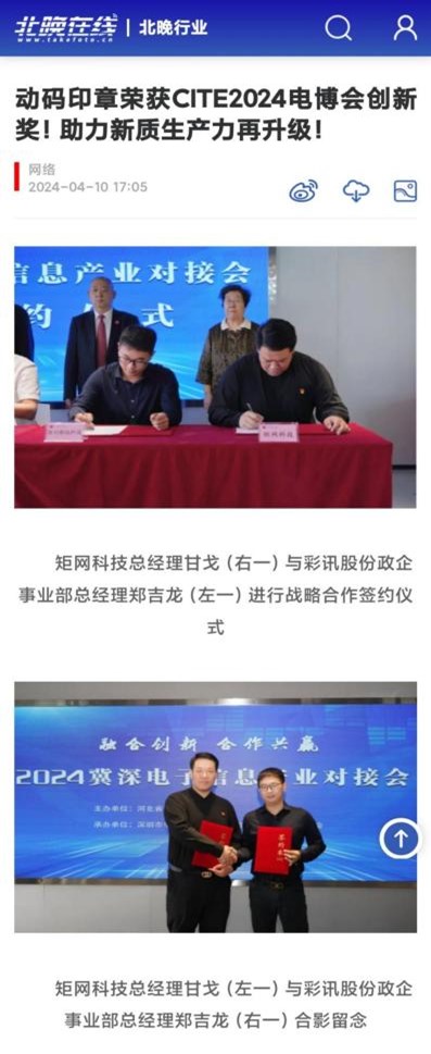 4月9日—11日,由工业和信息化部与深圳市人民政府联手打造、以“追求卓越,数创未来”为主题的国家级电子信息全产业链展示平台——CITE2024第十二届中国电子信息博览会(以下简称“电博会”)在深圳会展中心(福田)隆重召开。矩网科技有限公司(以下简称“矩网科技”)由河北省信息产业与信息化协会带队参展。矩网科技总经理甘戈一行携动码印章产品及技术,带来前瞻性的印章技术展示,动码印章因其杰出的技术实力和创新性成果,荣获“第十二届中国电子信息博览会创新奖”。