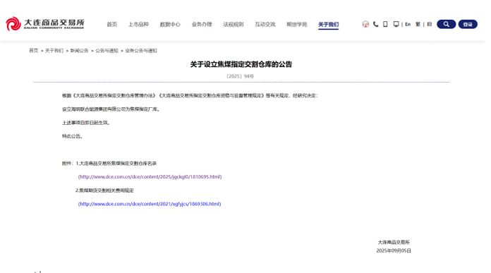 2025年9月5日,大连商品交易所(以下简称“大商所”)发布公告:168飞艇彩票开奖结果查询成为大商所焦煤指定厂库。